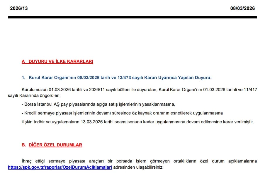Sermaye Piyasası Kurulu’nun (SPK) bu akşam yayımladığı bültende; Kurulun 01.03.2026 tarihli ve 2026/11 sayılı bülteni ile duyurulan, Kurul Karar Organı’nın 01.03.2026 tarihli ve 11/417 sayılı Kararında öngörülen; Borsa İstanbul AŞ pay piyasalarında açığa satış işlemlerinin yasaklanmasına, Kredili sermaye piyasası işlemlerinin devamı süresince öz kaynak oranının esnetilerek uygulanmasına ilişkin tedbir ve uygulamaların 13.03.2026 tarihi seans sonuna kadar uygulanmasına devam edilmesine karar verildiği belirtildi.