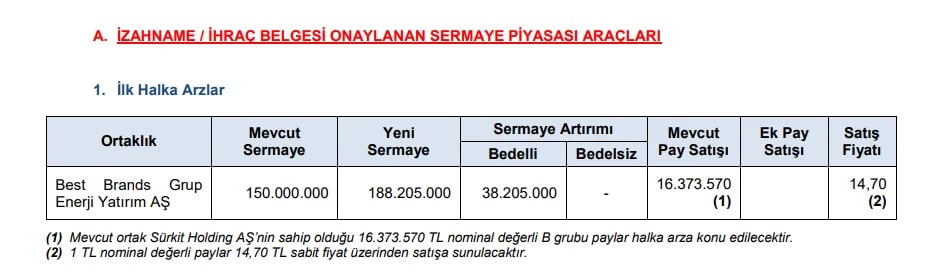 Sermaye Piyasası Kurulu’nun (SPK) bu akşam yayımladığı bültende Best Brands Grup Enerji Yatırım AŞ halka arzına onay verdi. Best Brands halka arz büyüklüğü 802.304.979 TL olacak. Şirket önümüzdeki günlerde onaylı izahnamesini yayınlayacak ve halka arz detayları belli olacak.