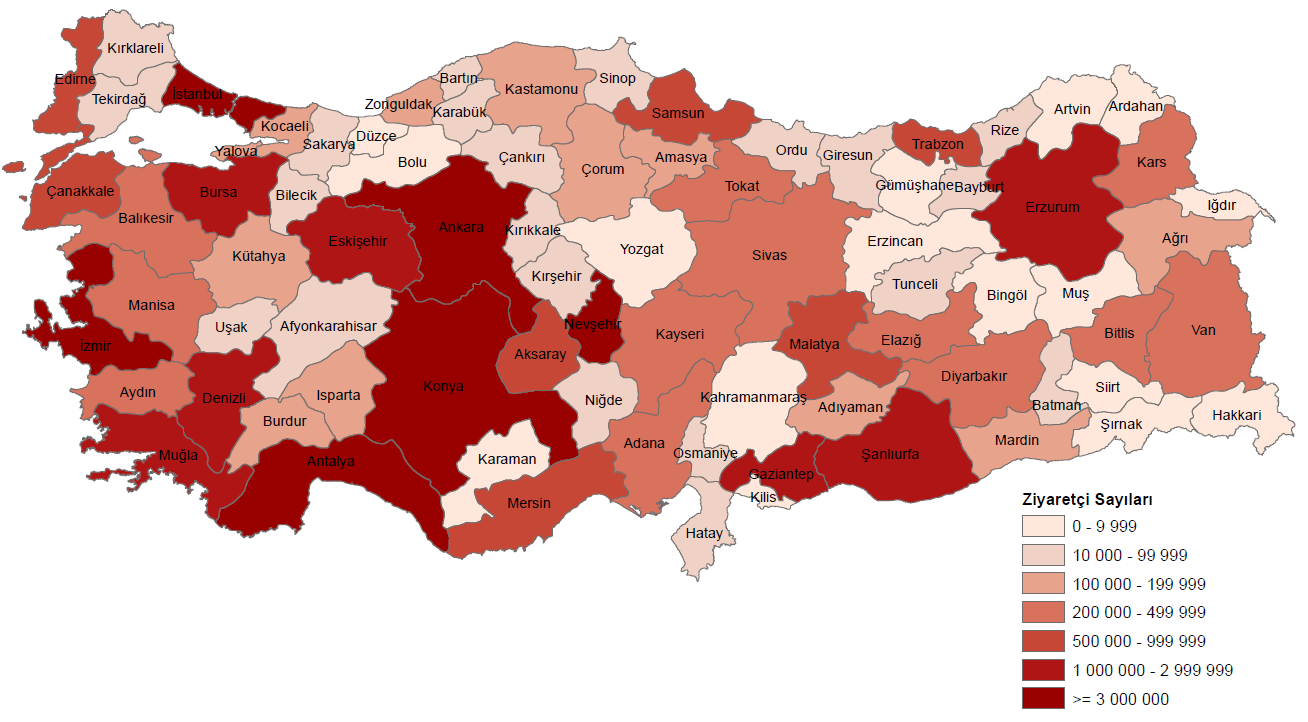 En yüksek müze ziyaretçi sayıları; 18 milyon 182 bin 745 ile İstanbul, 4 milyon 698 bin 641 ile İzmir ve 4 milyon 451 bin 607 ile Nevşehir illerinde gerçekleşti.