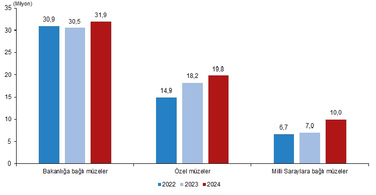 Müze ve ören yeri ziyaretçi sayısı, 2024 yılında %10,6 artarak 61 milyon 687 bin 726 oldu. Ziyaretçilerin %51,7’si Bakanlığa bağlı müze ve ören yerlerini ziyaret etti. Bakanlığa bağlı ücretli müze ve ören yerlerini ziyaret edenlerin sayısı 18 milyon 995 bin 286 ve toplam ziyaretçiler içindeki payı %30,8 oldu. Özel müze ziyaretçi sayısı %8,4 artarak 19 milyon 774 bin 549 olurken Milli Saraylar Başkanlığına bağlı müze ziyaretçi sayısı %42,3 artarak 9 milyon 999 bin 370 oldu.