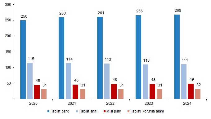 Milli parkların sayısı 2024 yılında bir önceki yıla göre %2,1 artarak 49 oldu, milli park alanı %0,4 artarak 913 bin 160 oldu. Tabiat parkı sayısı %0,8 artarak 268’e yükselirken, tabiat parkı alanı %12,9 azalarak 94 bin 88 hektar oldu. Tabiatı koruma alanı sayısı önceki yıla göre %3,2 artarak 32 olurken, tabiat anıtı sayısı %0,9 artarak 111 oldu.