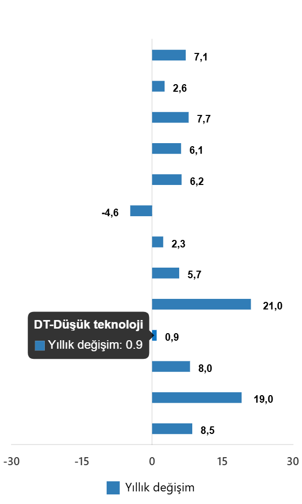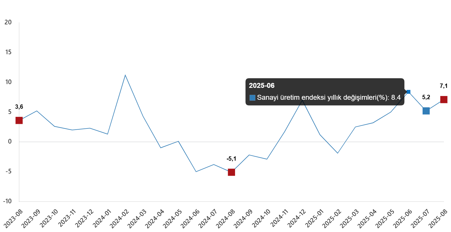 Sanayi üretimi yıllık %7,1 arttı! Sanayinin alt sektörleri (2021=100 referans yıllı) incelendiğinde, 2025 yılı Ağustos ayında madencilik ve taş ocakçılığı sektörü endeksi bir önceki yılın aynı ayına göre %2,6 arttı, imalat sanayi sektörü endeksi %7,7 arttı ve elektrik, gaz, buhar ve iklimlendirme üretimi ve dağıtımı sektörü endeksi %6,1 arttı.