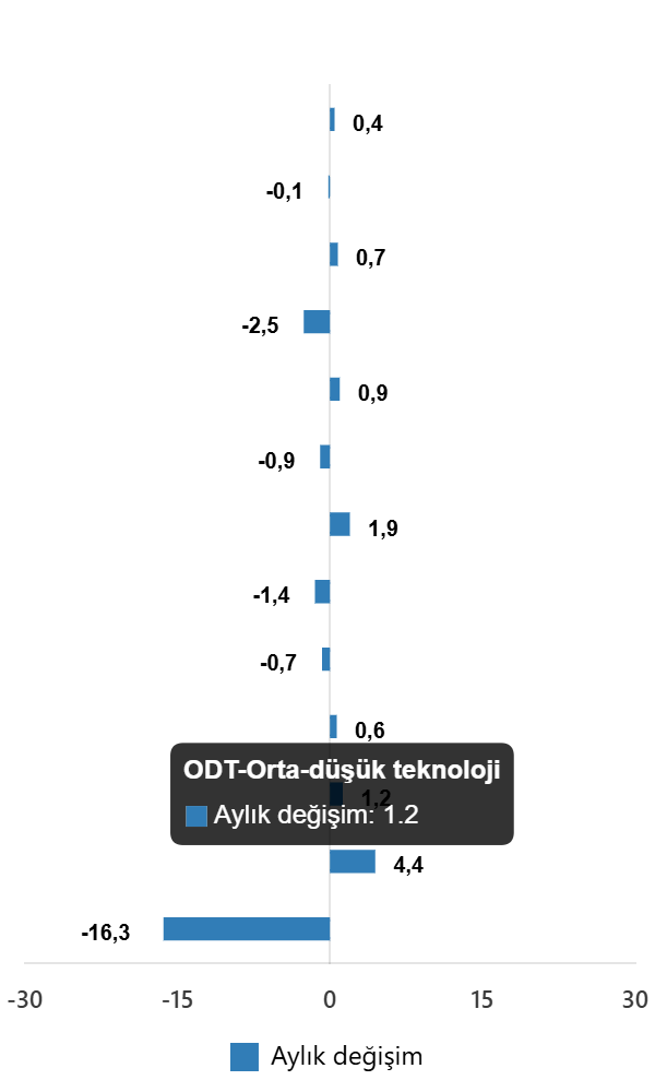 Sanayinin alt sektörleri incelendiğinde, 2025 yılı Ağustos ayında madencilik ve taş ocakçılığı sektörü endeksi bir önceki aya göre %0,1 azaldı, imalat sanayi sektörü endeksi %0,7 arttı ve elektrik, gaz, buhar ve iklimlendirme üretimi ve dağıtımı sektörü endeksi %2,5 azaldı.