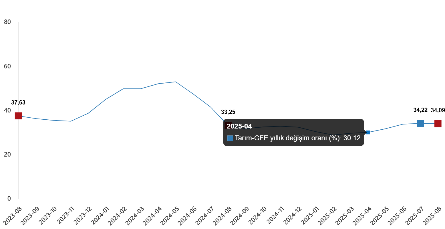 Tarım-GFE‘de (2020=100), 2025 yılı Ağustos ayında bir önceki aya göre %1,30 artış, bir önceki yılın Aralık ayına göre %23,81 artış, bir önceki yılın aynı ayına göre %34,09 artış ve on iki aylık ortalamalara göre %31,94 artış gerçekleşti.