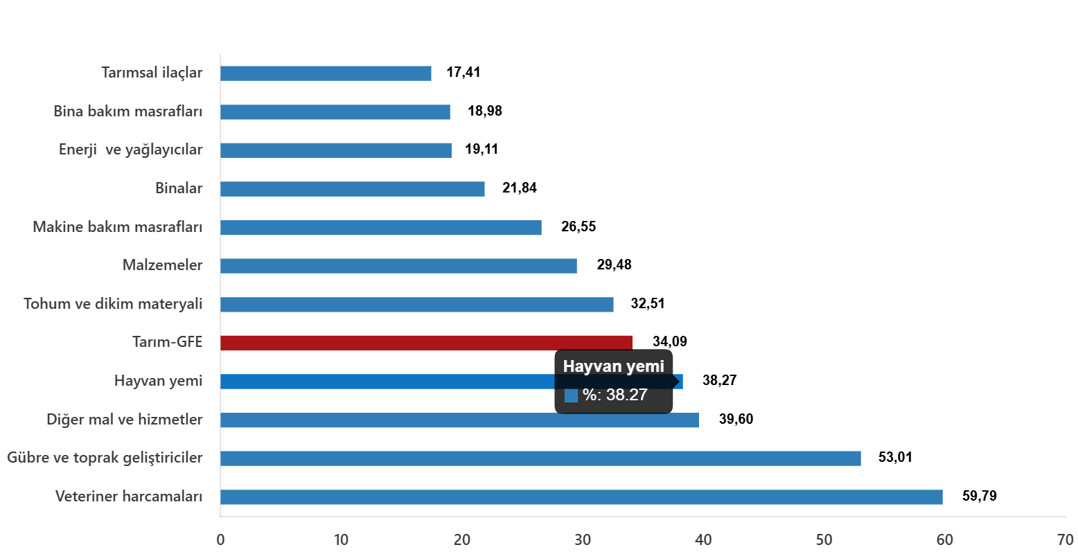 Yıllık değişimin en yüksek olduğu alt grup %59,79 artış ile veteriner harcamaları, aylık değişimin en yüksek olduğu alt grup %3,94 artış ile gübre ve toprak geliştiriciler oldu.